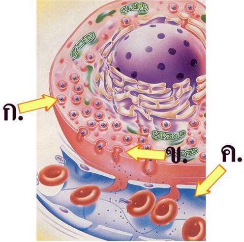 ข. คือการ "คัดหลั่ง" ของเม็ดอินซูลินดังกล่าว ออกไปจากเซลล์ (จะเห็นได้ว่าจากเม็ดสีฟ้าเม็ดใหญ่นั้น มันจะแตกตัวลอยออกไป)