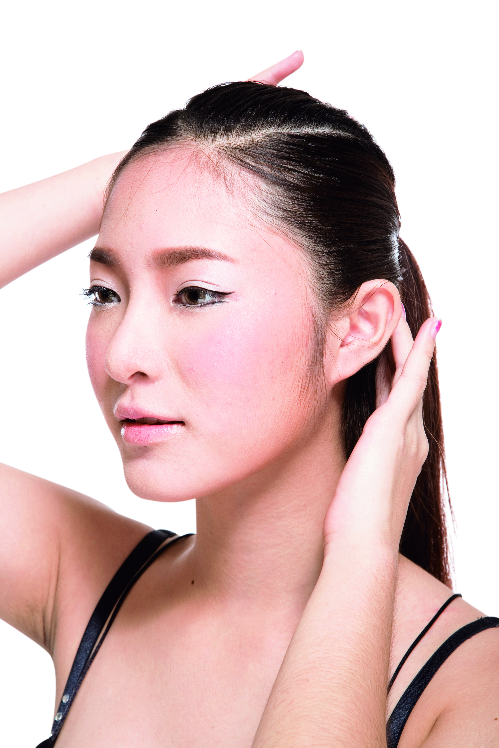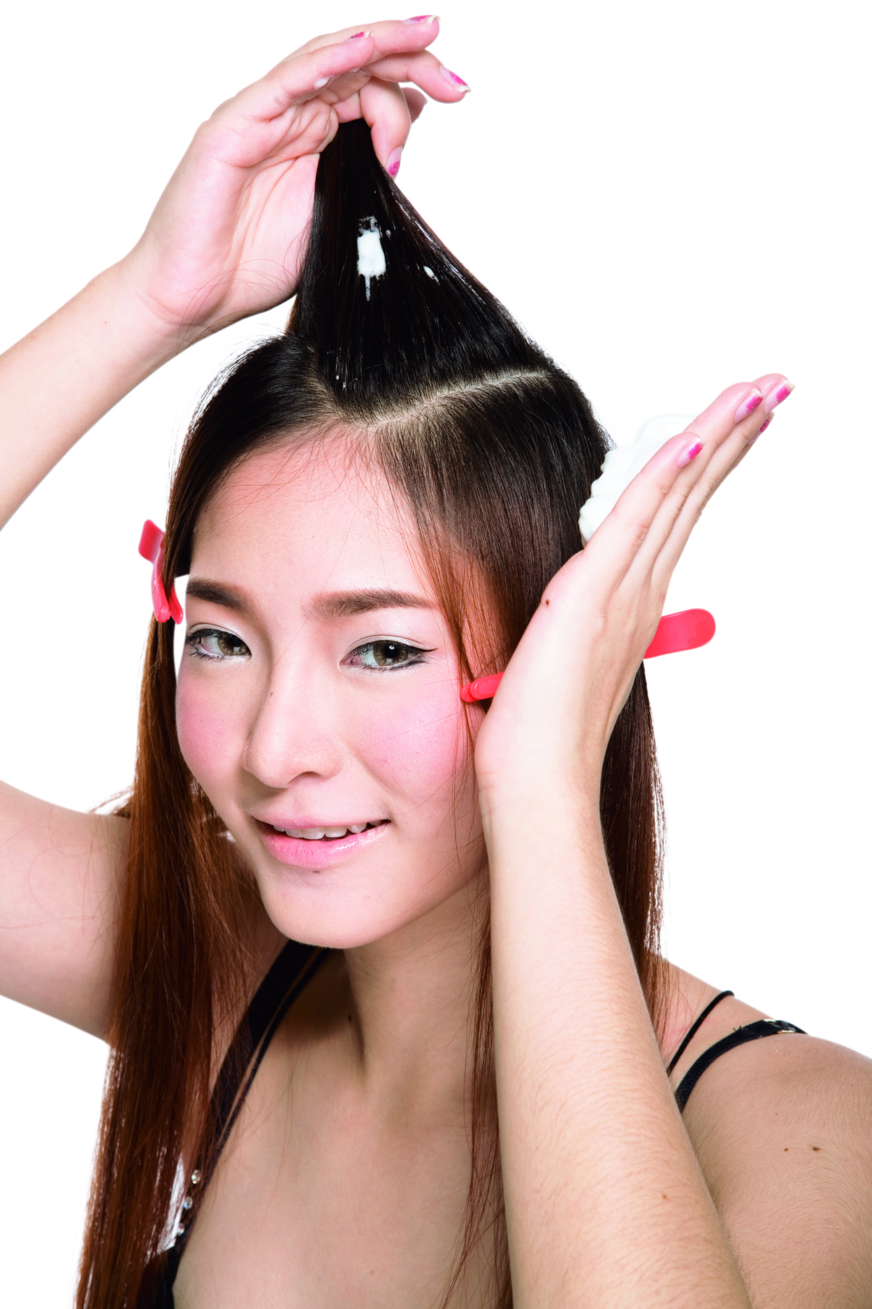 1. แบ่งผมออกเป็น 3 ส่วน คือผมด้านข้าง 2 ส่วน และด้านหลังรวบเป็นหางม้าดังภาพ