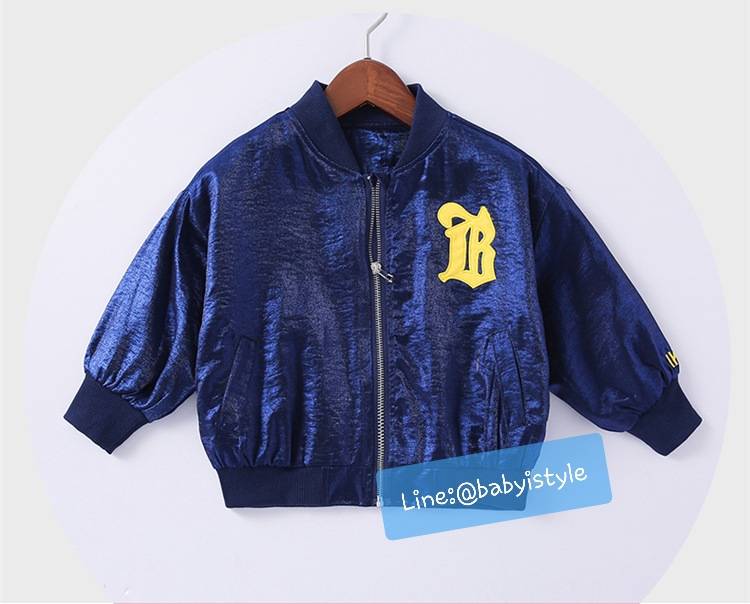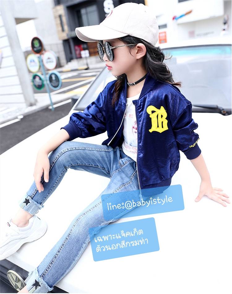 เด็กโต-เสื้อแจ็คเก็ตแขนยาวจั๊มพ์สีกรมท่า งานปักB มีซิปหน้า มีกระเป๋าข้าง ทรงไหล่สโลป (ไม่มีเสื้อตัวในและกางเกง) มีซับใน งานสวยน่ารัก ไซส 140/150/160