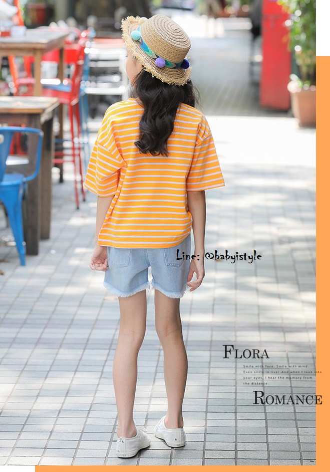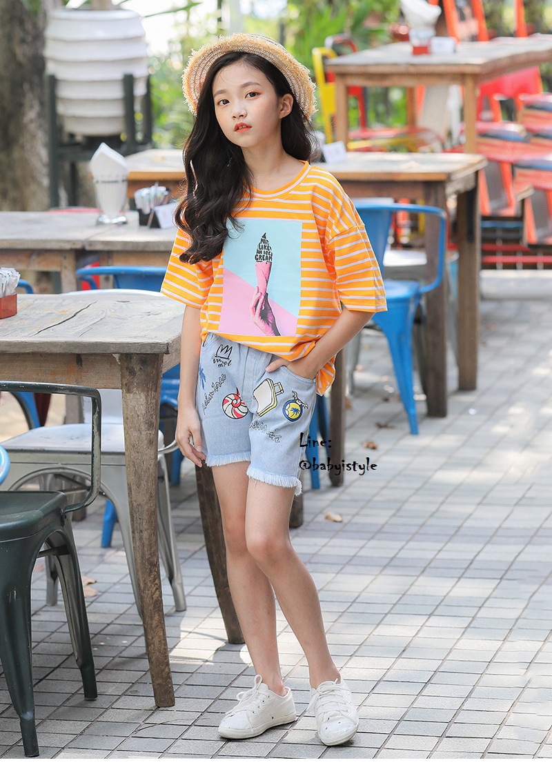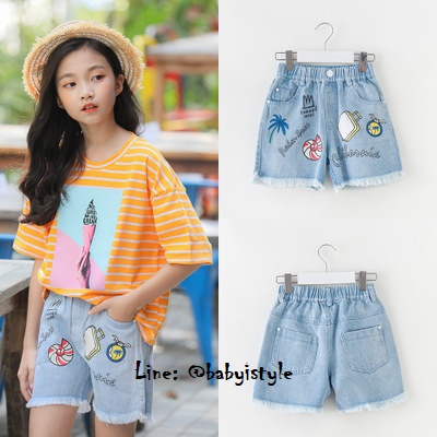 เด็กโต-กางเกงยีนส์ฟอกขาสั้นชายปล่อย สกรีนกระเป๋าและเปลือกหอย เอวยางยืด มีกระเป๋าหลัง งานสวยเก๋ (ไม่รวมเสื้อ)