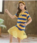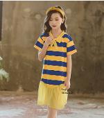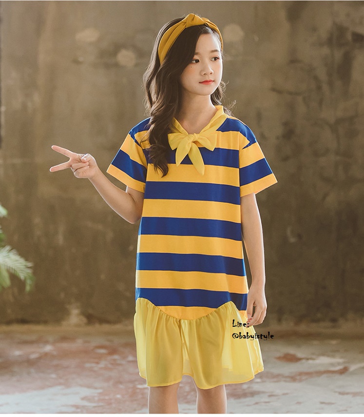 เด็กโต-เดรสแขนสั้นลายริ้วสีเหลือง-น้ำเงินผูกริบบิ้นชีฟองและชายต่อระบาย ผ้าดี สวยเก๋