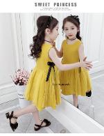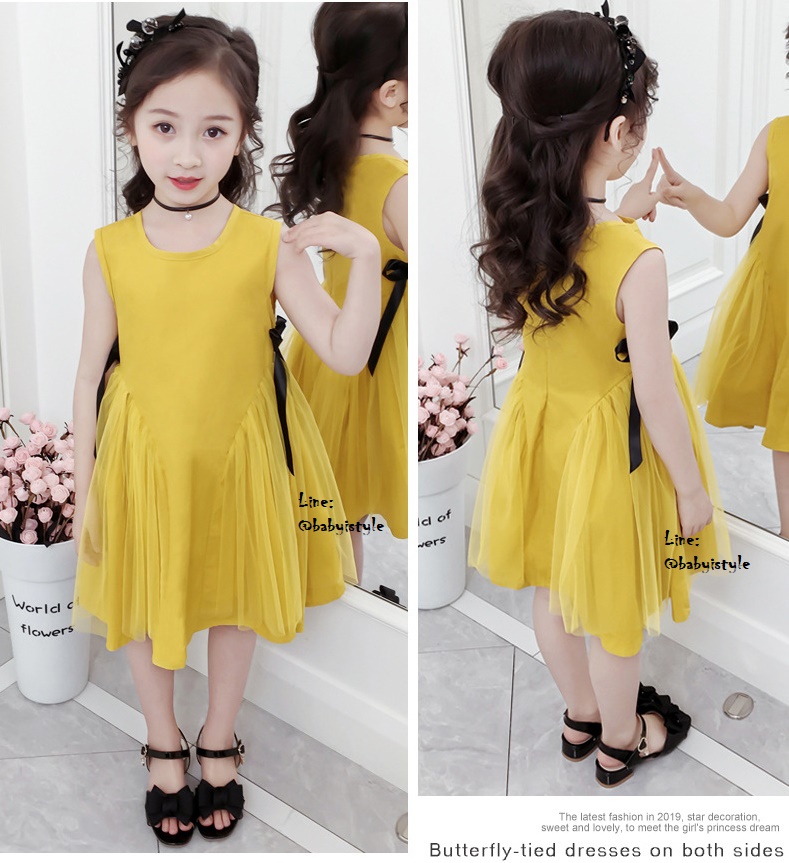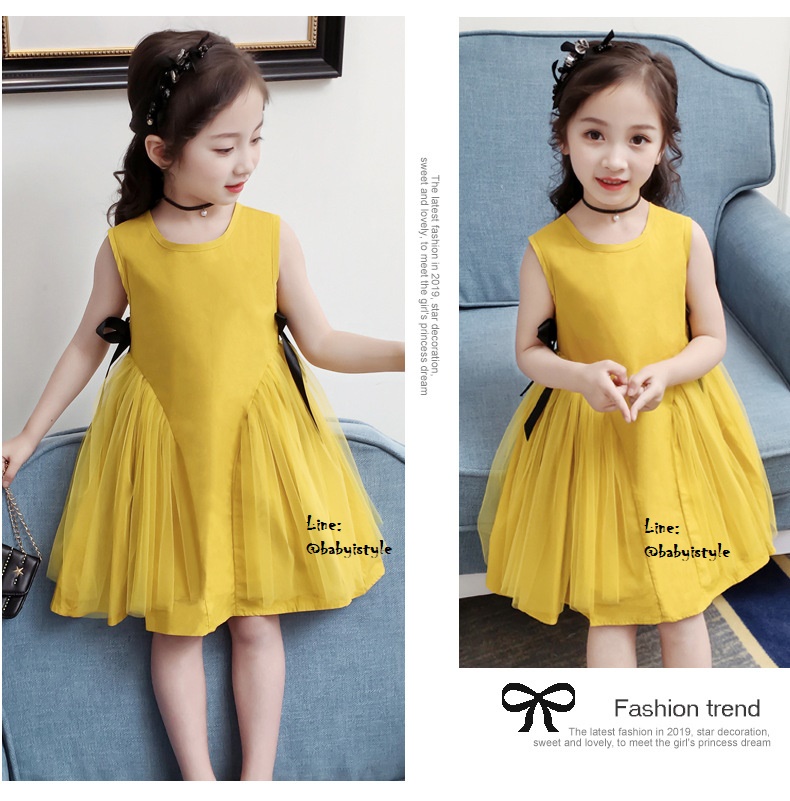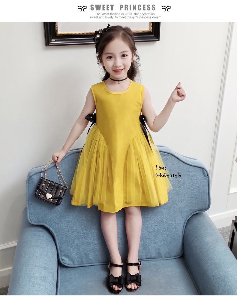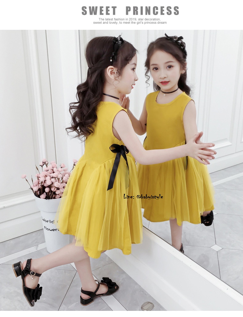 เด็กโต-เดรสแขนกุดทรงเอสีเหลืองมัสตาร์ด ด้านข้างแต่งผ้าโปร่งและริบบิ้นผูกโบว์สีดำ มีซิปหลัง ผ้าคอตตอน สวยเก๋