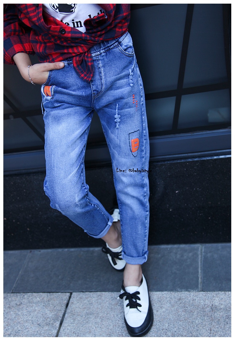 เด็กโต-กางเกงยีนส์ฟอกขายาวแต่งขาดๆ ปัก N B