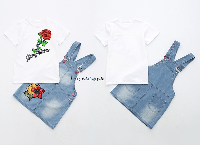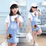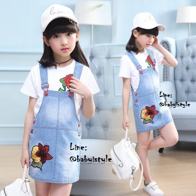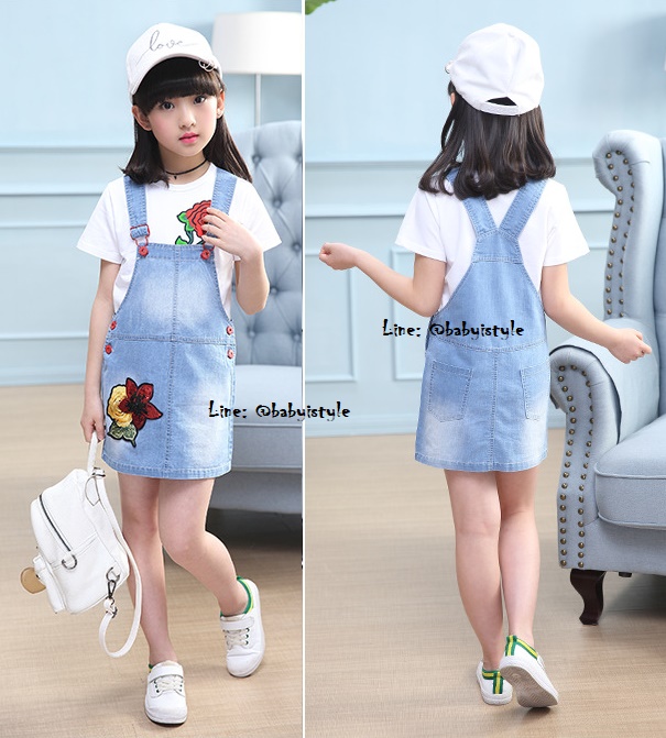 เด็กโต-เฉพาะเอี๊ยมกระโปรงยีนส์เทียม(บาง) ปักดอกไม้แดง มีกระเป๋าหลัง สายปรับได้ งานสวยน่ารัก