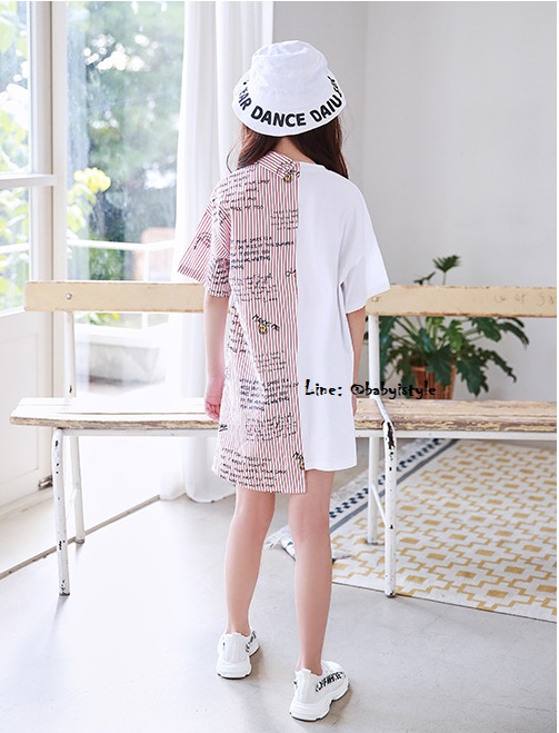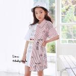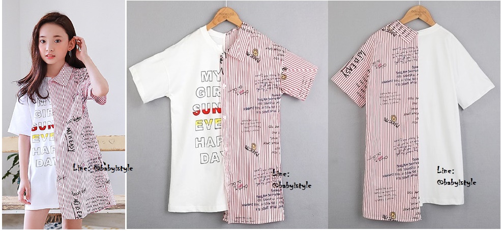 เด็กโต-เดรสแขนสั้น 2 สไตล์คอยืดสีขาว+คอเชิ้ตลายริ้วแดง สกรีนอักษร แต่งกระดุม(เม็ดบนสุดแกะได้)