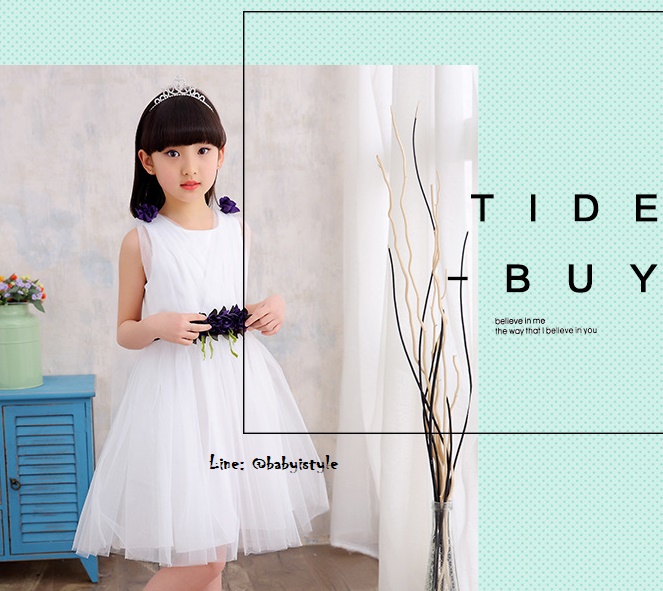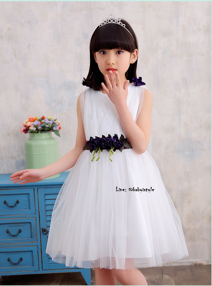 เด็กโต-เดรสออกงานแขนกุดสีขาว เอวแต่งดอกไม้สีม่วงผูกริบบิ้นหลัง บ่าแต่งดอกไม้และผ้าตาข่ายยาวกระโปรงฟูฟ่อง มีซับใน มีซิปหลัง งานสวยเริ่ดมากๆ ไซส์ 140/150/160
