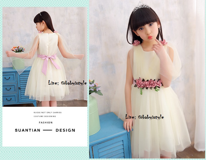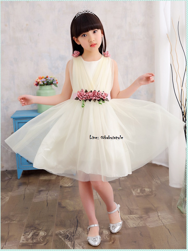 เด็กโต-เดรสออกงานแขนกุดสีครีม เอวแต่งดอกไม้สีชมพูผูกริบบิ้นหลัง บ่าแต่งดอกไม้และผ้าตาข่ายยาวกระโปรงฟูฟ่อง มีซับใน มีซิปหลัง งานสวยเริ่ดมากๆ ไซส์ 140/150/160