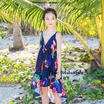 *Sales เด็กโต-เดรสสายเดี่ยวสีกรมท่าลายสับปะรด/นกแก้วอกและเอวยางยืดไซส์150/170รหัสKKK910B