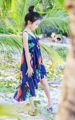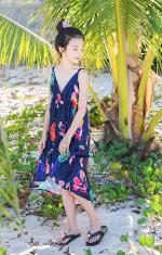 เด็กโต-เดรสสายเดี่ยวสีกรมท่าลายสับปะรด/นกแก้ว ช่วงรอบอกและเอวยางยืด หน้าสั้นหลังยาว มีซับในช่วงรอบอก