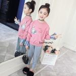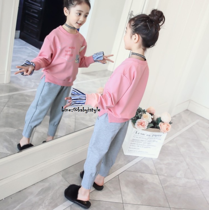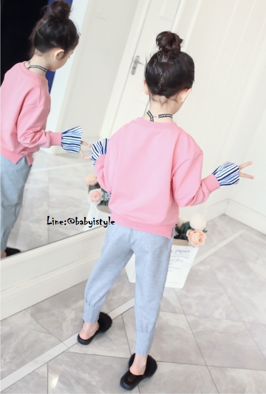 เด็กโต-ชุด2ชิ้นเสื้อสีชมพูลายกระต่ายแขนยาวจั๊มพ์ต่อผ้าลายริ้ว