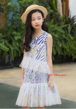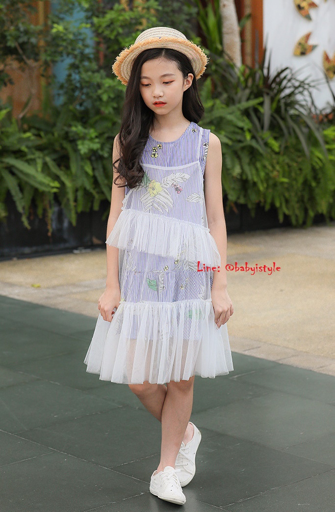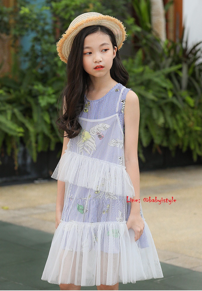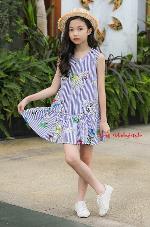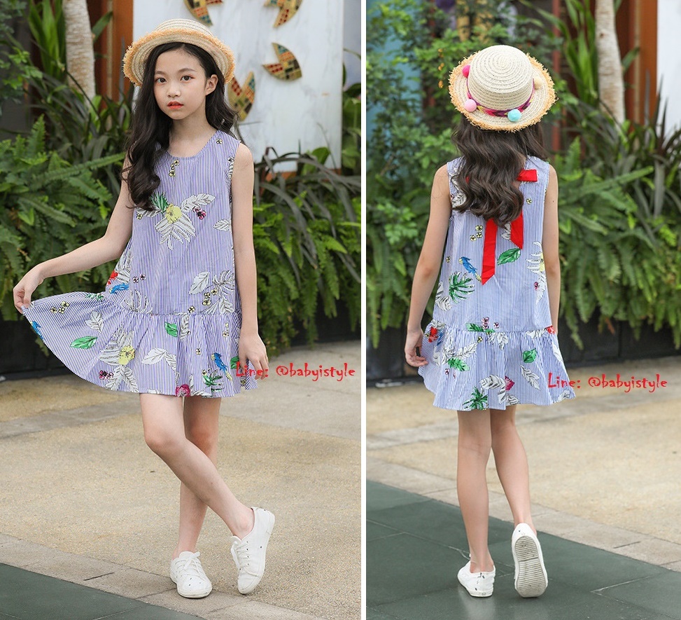 เด็กโต-ชุด 2 ชิ้น เดรสแขนกุดใบไม้ลายริ้วสีน้ำเงิน ชายระบาย ผูกโบว์แดงปกหลัง
