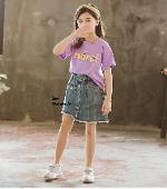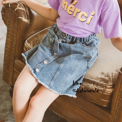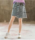 เด็กโต-กระโปรงสั้นยีนส์ฟอกชายเฉียงปล่อยๆ แต่งกระดุมหน้า เอวยางยืด มีกระเป๋าหน้า-หลัง งานสวยเก๋ (ไม่รวมเสื้อ)
