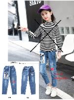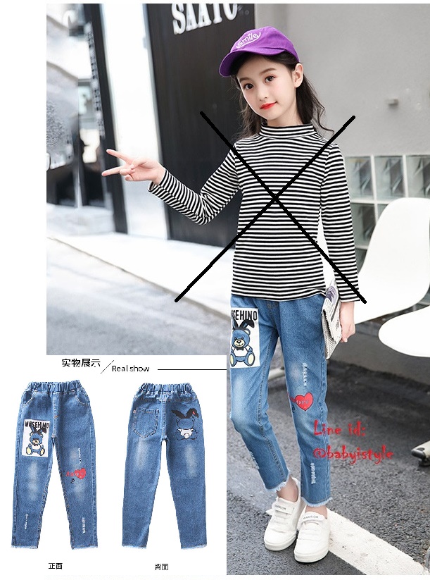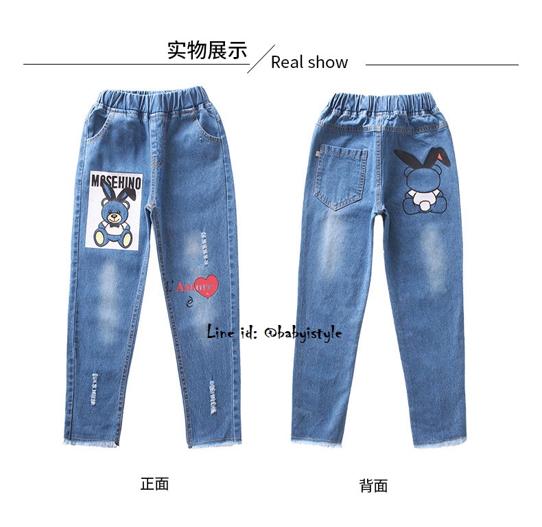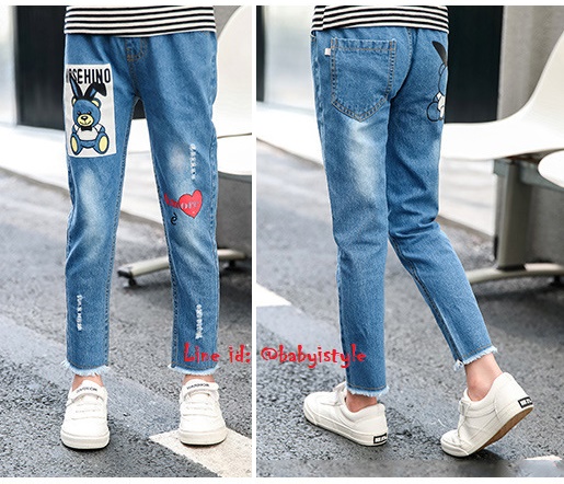 เด็กโต-กางเกงยีนส์ขายาวเดฟสกรีนหมี สกิดขาดนิดๆ ชายปล่อย เอวยางยืด มีกระเป๋าหน้า-หลัง งานสวยเก๋ (ผ้าไม่ยืดนะค่ะ)