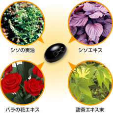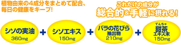 น้ำหนักรวมของ 3 แคปซูลต่อวัน 1,350 mg น้ำมันเมล็ดของ Perilla ต่อ 360mg (กรด α - A - linolenic 198mg ), สารสกัดจากกลีบกุหลาบ (เป็น Oigeniin 0.12mg) 210mg, สารสกัด 150mg Perilla ( 2mg กรด rosmarinic, 0.5mg รวม luteolin), สารสกัดจากผง甜茶 ( 5 โพลีฟีน%) 150mg -- วัตถุดิบหลัก -- น้ำมันมินต์ สารสกัดจากกลีบกุหลาบสารสกัด perilla 甜茶ผงและครีม -- ขี้ผึ้ง, เลซิติน (จากยีนถั่วเหลือง เจลาตินห่อหุ้ม)