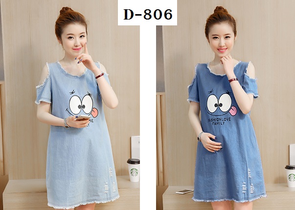 เดรสคลุมท้องแฟชั่น ผ้ายีนส์นิ่มเว้าช่วงไหล่ สวมใส่สบาย ด้านหน้าสกรีนลายน่ารักมาก รหัสสินค้า D-806 ราคา 380 บาท