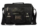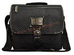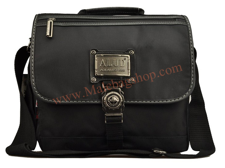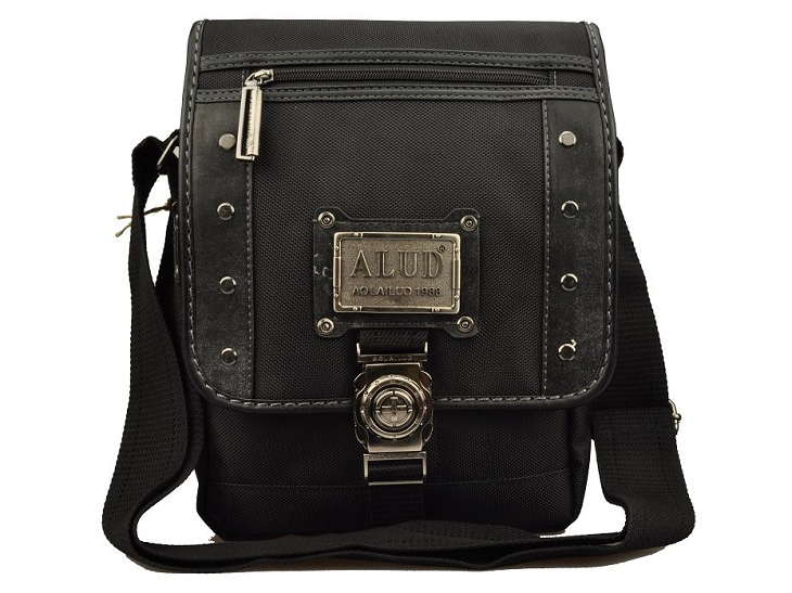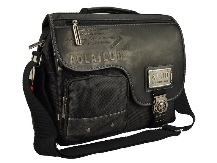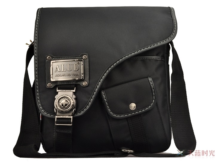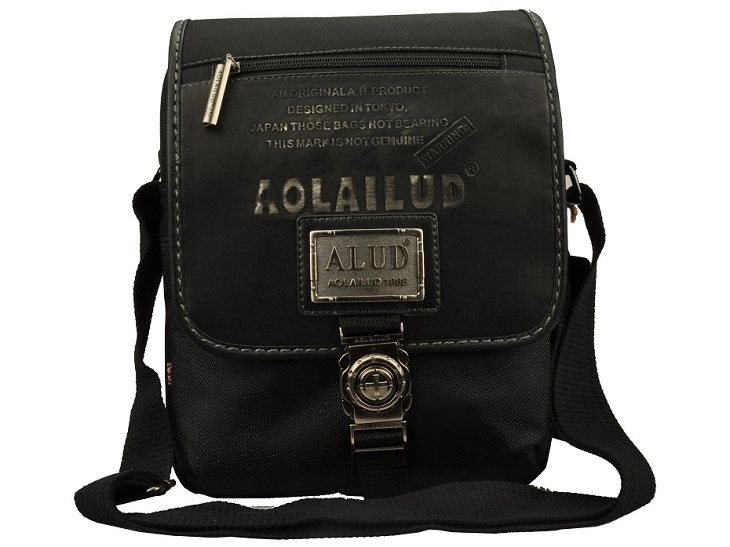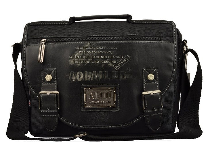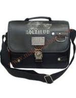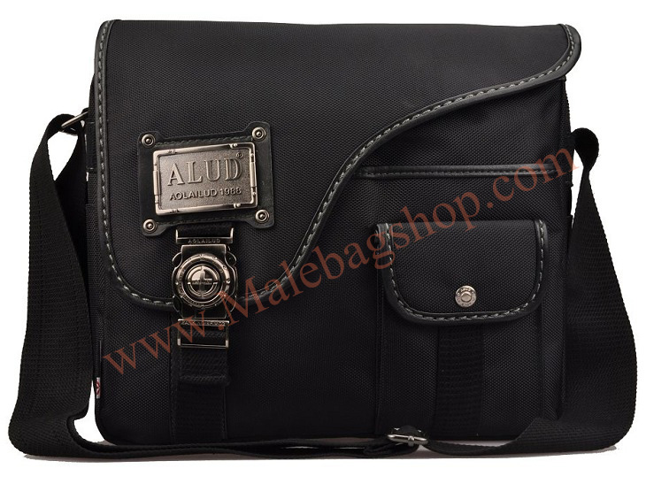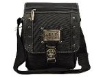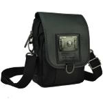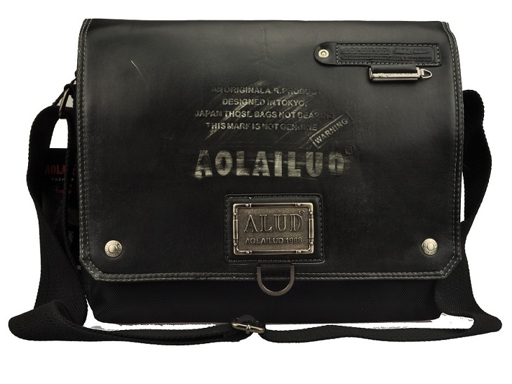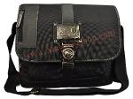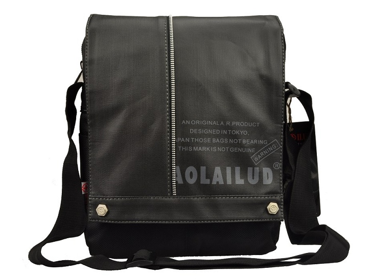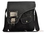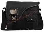 กระเป๋าทำจากผ้ากัน ทรงยาวสายข้างพื้นสีดำ ดีไซน์เก๋มาพร้อมกับลายปักริบนูนเด่นชัดเพิ่มความน่าสนใจที่ตัวอักษรหน้ากระเป๋าและอุปกรณ์ตกแต่งเหล็กพิมพ์ลาย แสดงถึงความแข็งแรงทนทานของผู้ใช้สอย นอกจากนี้ยังมีที่ใส่ของเพิ่มเติมอยู่ทางด้านหน้าของกระเป๋า