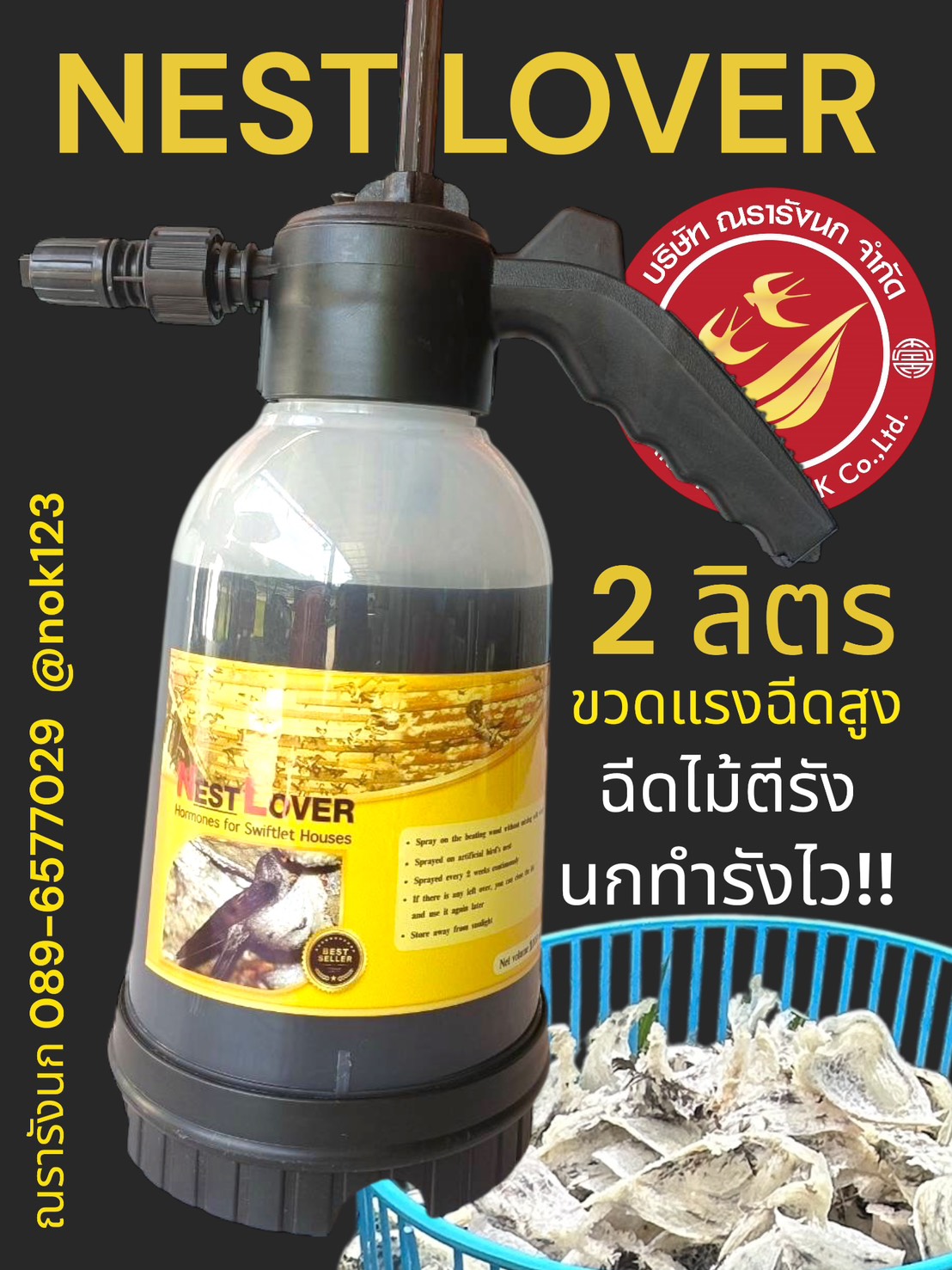 NEST LOVER ฮอร์โมนฉีดไม้ตีรังยอดนิยม ดึงนกนอนทำรังรวดเร็ว 2 ลิตร มาในขวดแรงฉีดสูง การใช้งานโดยฉีดพ่นบนไม้ตีรัง ไม่ต้องผสมน้ำ จะช่วยดึงดูดนกให้นอนทำรังได้อย่างรวดเร็ว